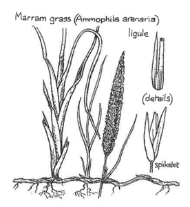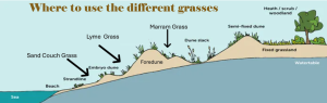 Marram (Ammophila arenaria) is the most common dune-building plant. Erosion at the front edge of the dunes frequently means that the other 2 key plants are not available for transplant or propagation. Marram is not as salt tolerant as Lyme and Sand Couch so is not really suited to the front edge, or growing new dunes.