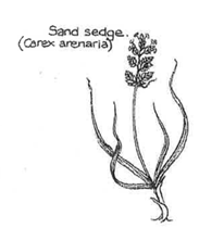 Sand sedge (Carex arenaria) has a similar growth form to dune grasses, although not a grass itself. In some places, e.g. Braunton Burrows, Devon, it helps to stabilise very gritty sea-facing eroding slopes where it withstands the battering of blown grit better than marram. Usually, it grows in dry slacks, where it spreads over the surface via straight runners to form a loose network, occasionally colonising the sand slopes to either side. Although it only grows a few inches high, it might prove useful for stabilisation work provided it could be successfully transplanted.